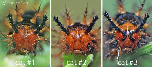 The 3rd instar caterpillar resembles the 2nd instar caterpillar closely except for the change of the body colour to mostly dark brown to dark purplish brown. Another discernible change is the proportionate increase in the length of the spiny processes covering the body surface and two cephalic horns. This instar takes about 2-2.5 days to complete with body length reaching about 11-12mm.