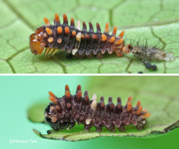 In the 3rd instar, the fleshy processes are proportionately longer and more pointed, the body is in a dark shade of reddish brown while the distal end of body processes are in a contrasting wine red. The white saddle mark on the 3rd abdominal segment is now rather prominent. This instar takes about 2 days to complete with the body length reaching up to 14mm.